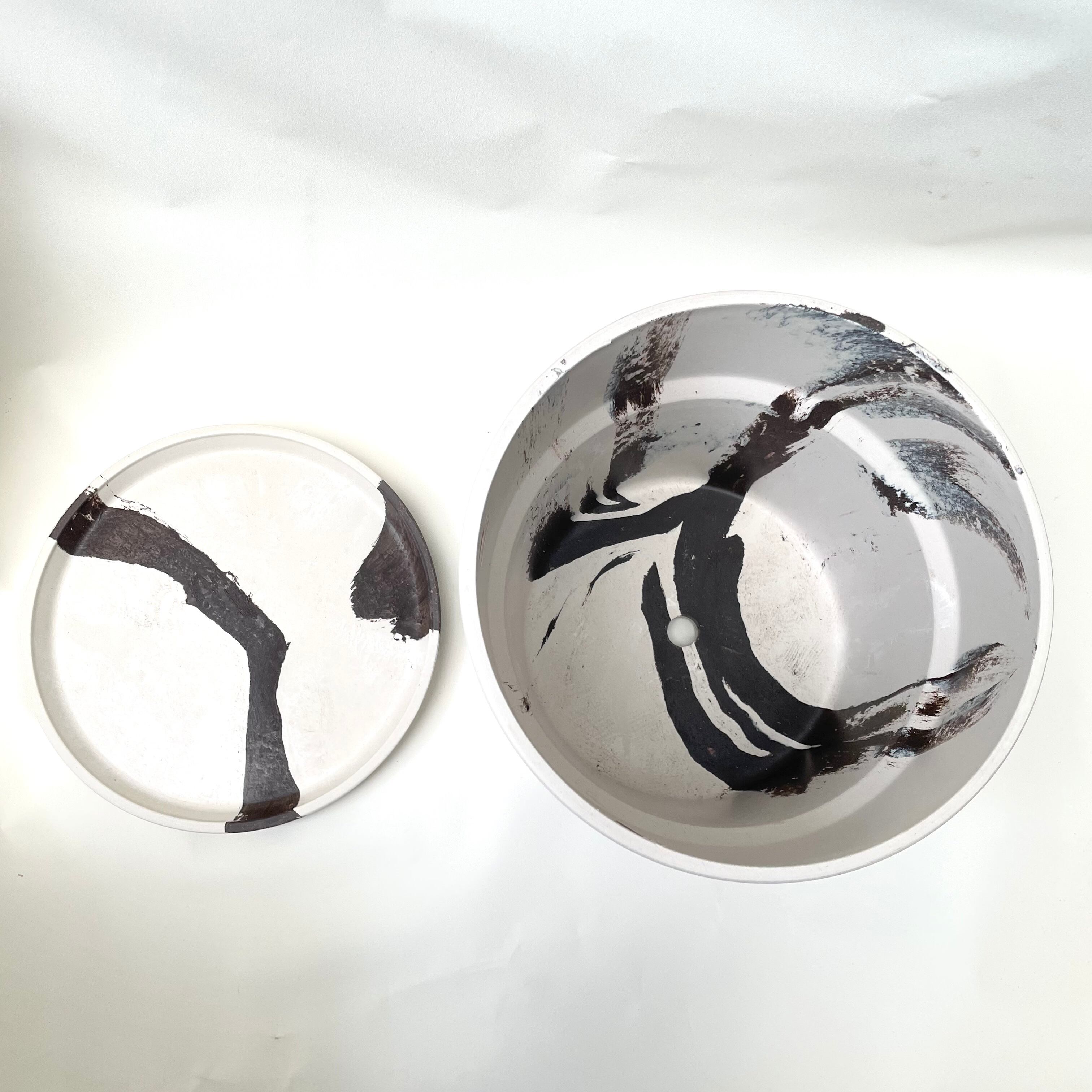 リサイクル素材でできたプランツポット。材質はストーンパウダーやおかくず、樹脂などを混ぜ合わせた合成樹脂。軽くて割れにくいのも特徴です。ソーサーがセットになっております。